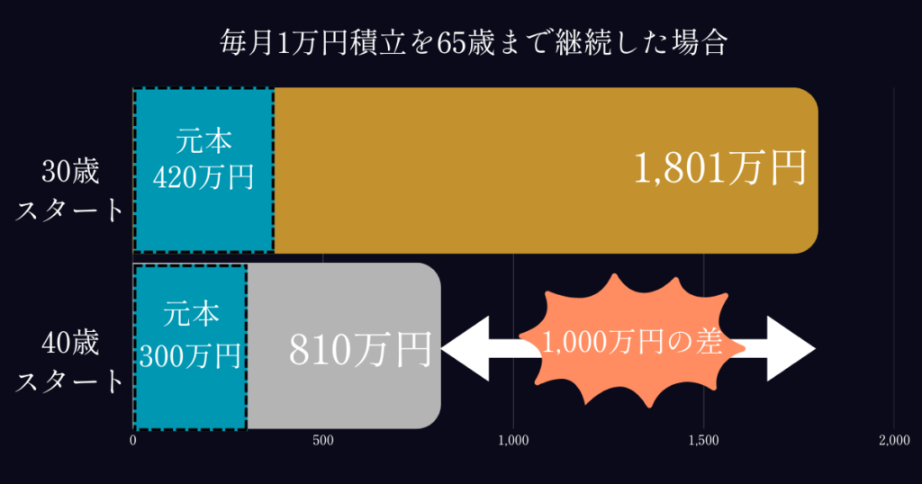 また30歳と40歳を比べると、月1万円でも10年早く始めることで約1,000万円近い差が生まれる。