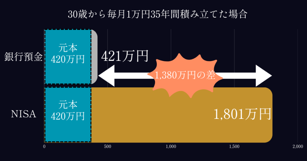 30歳から月1万円、35年間続けた場合、銀行預金では約421万円。インデックス投資では約1,801万円。同じお金を使って、約1,380万円の差が生まれる。