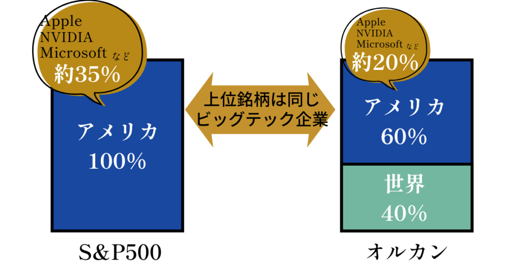 S&P500とオルカンは全く別物に見えるが、実は兄弟のような関係だ。オルカンは「全世界株式」といっても、その約60%はアメリカの株で構成されている。しかもApple・Microsoft・Nvidia・Amazonなどのビッグテック企業は、どちらの投資先にも上位で入っている。